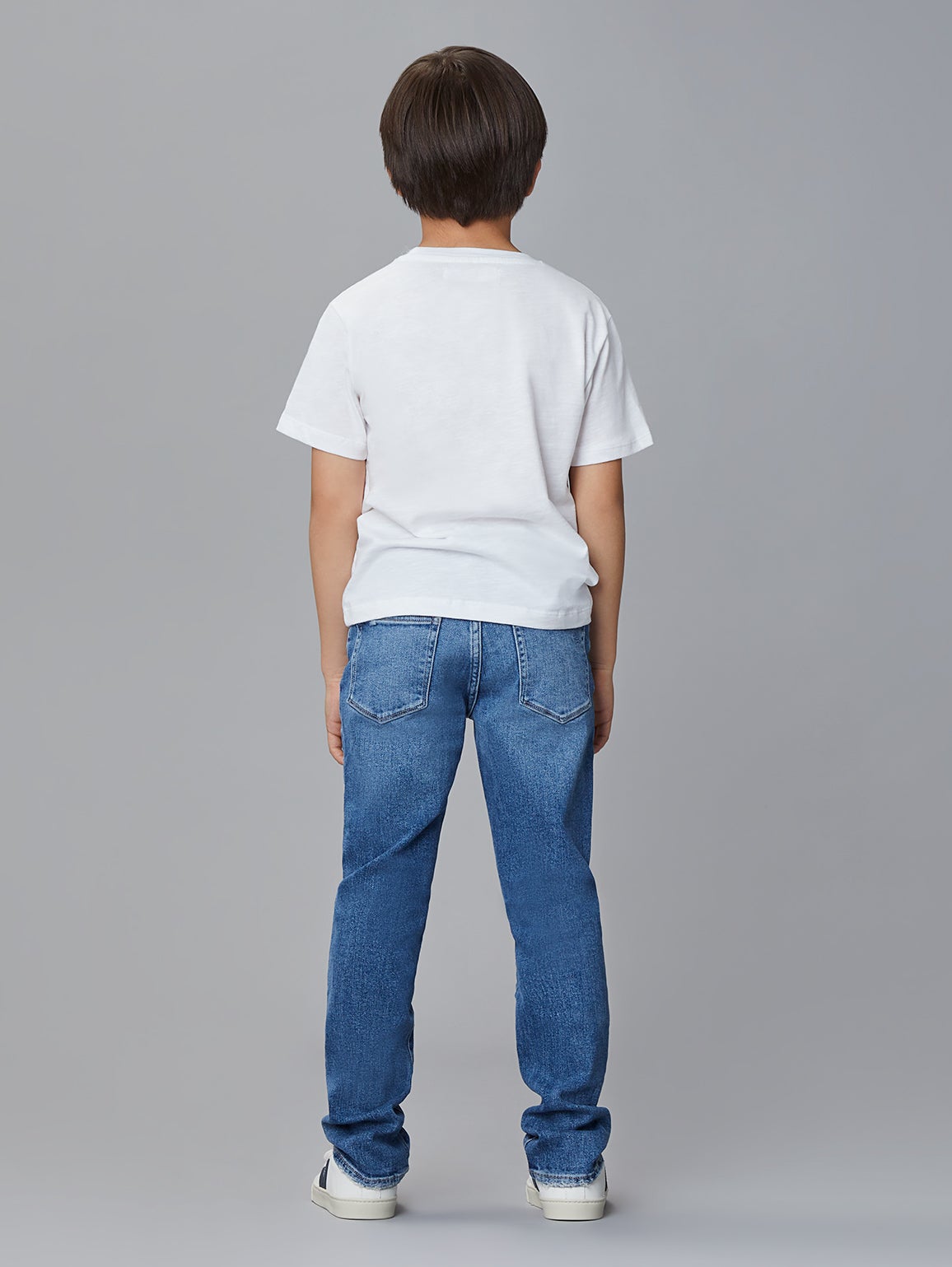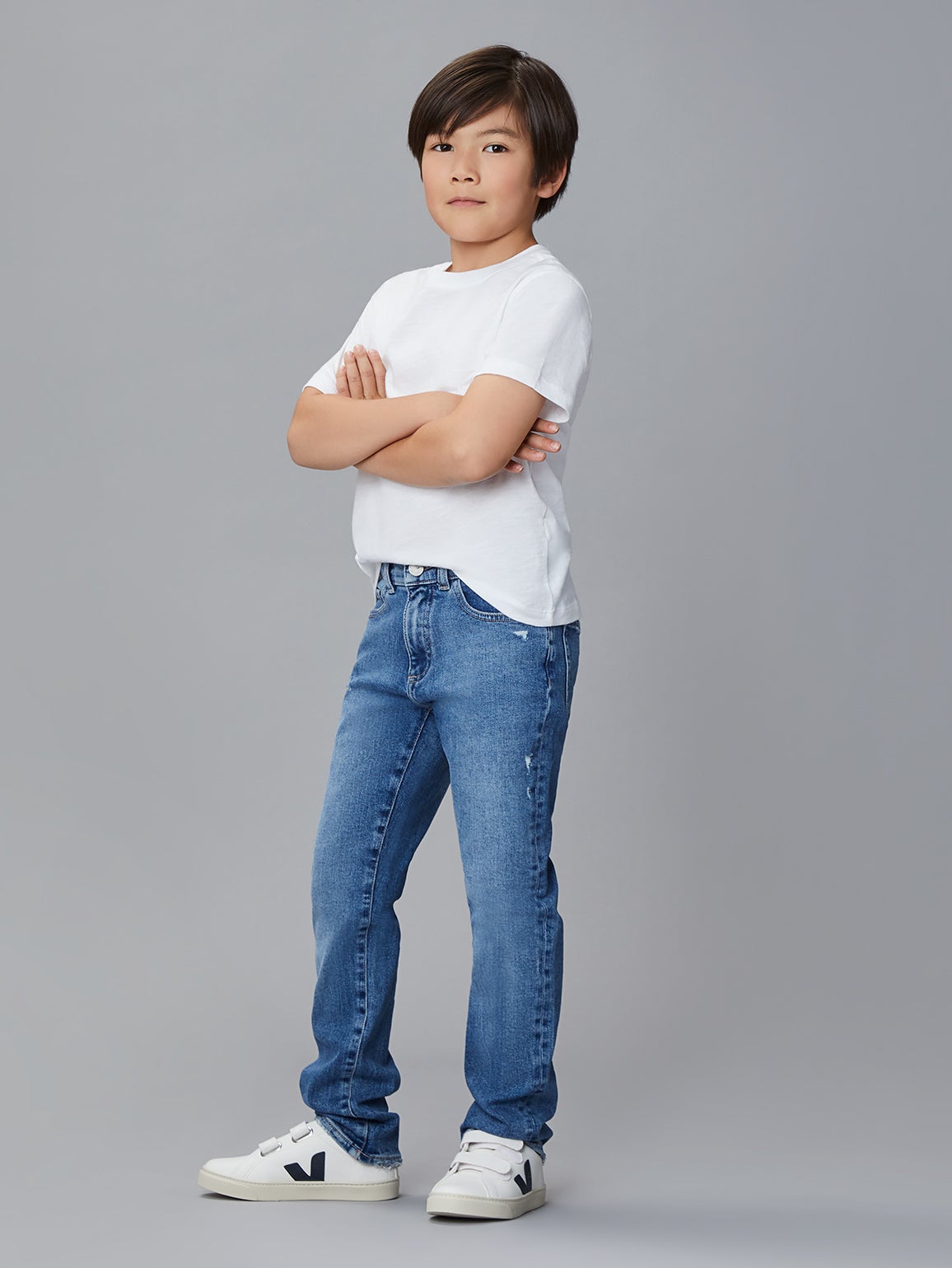 Glacier Distressed is a mid wash with authentic character, subtle sanding, grinding on hem, and all over nicking. It features light khaki stitching, antique silver hardware, zip fly, and a clean hem.