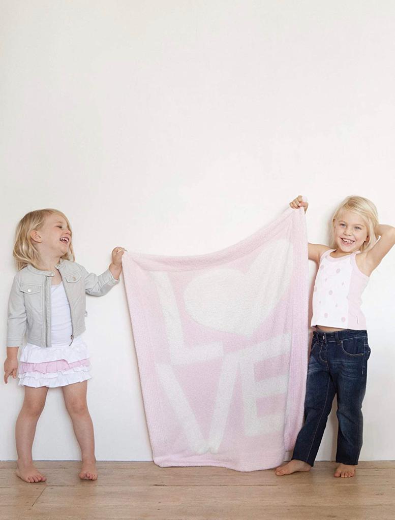 GIVE THE GIFT OF LOVE WITH OUR SNUGGLY CHIC BLANKET IN FEATHERY DOLCE™ KNIT. MADE WITH THE SOFTEST YARN ON EARTH, THE WORD "LOVE" BOLDLY INSCRIBES THIS SILKY BLANKET. BUNDLE UP YOUR LITTLE LOVE.