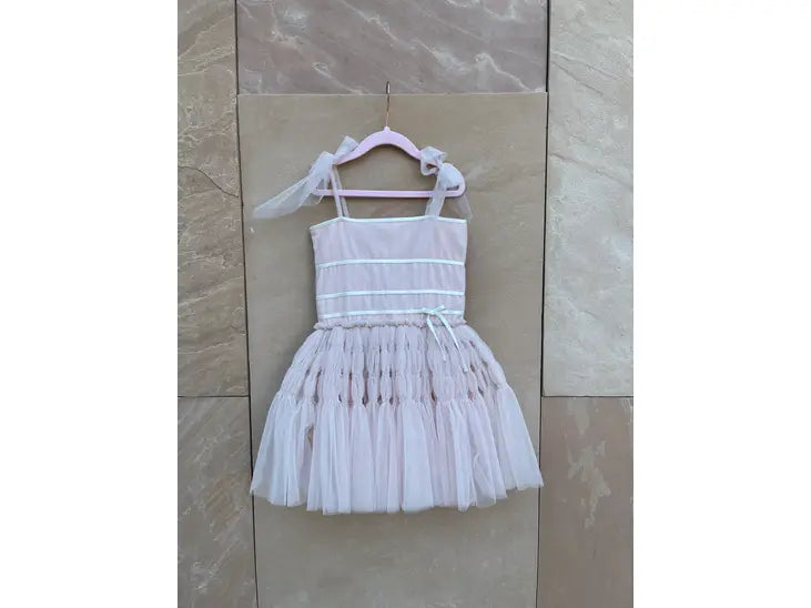 Wrapped up like a little gift, or petit four! Our contrast dress from fall '22 is back in pastels. The sky shade gives a tiffany vibe which makes it a perfect theme dress for any celebration.