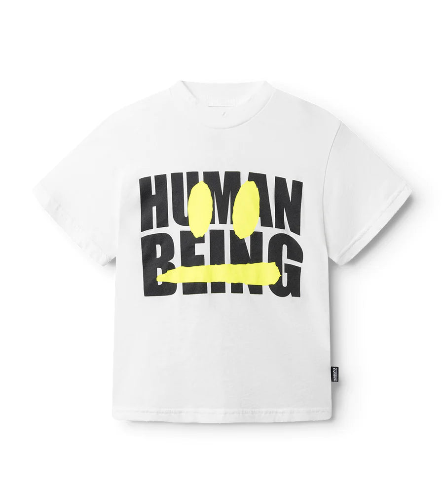 it’s time to get your smirk on with this super breezy & comfy white t-shirt for boys & girls. made from a light single cotton in a classic nununu cut, it’s got human being plastered on the front in big bold letters. all caps of course, because your kid doesn’t do anything the quiet way. plus, it’s got a neon yellow smirk to match your kid’s mischievous attitude and super cool custom deconstruction for that edgy vibe.