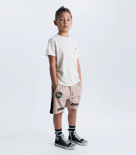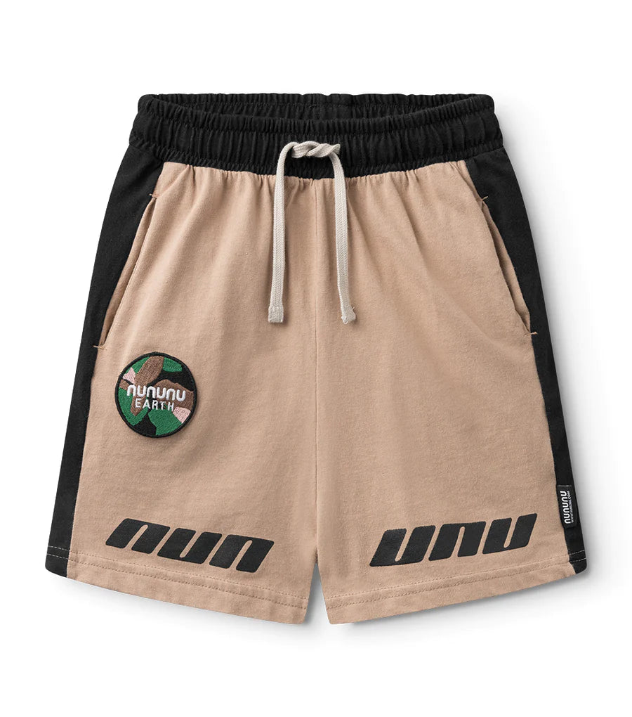 these gender neutral shorts might just be as rad as mother nature herself. made of heavy single cotton they are light & airy for the summer and keep it earthy in a wood brown outlined with black on the top & sides. plus it’s got a super cool nununu embroidered patch in a camo earth design. to top off this perfect pair of shorts nununu is written at the bottom in a solid type of print, just like the trees this piece is inspired by. the drawstring waistband is there to make sure these shorts stay put because your kid sure as hell won’t want to take them off.