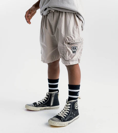 these way too swaggy smokey grey cargo shorts for boys & girls are feather light and ready for racing around & making mischief all summer long. they’re made of a super light poplin material that would practically float away without the drawstring waistband we added on there. peep the boxy cargo zip side pocket with a kooky skull embroidered patch created in collab with artist shay id alony. oh yeah and it’s got hidden pockets on the sides & a back pocket too because they can never have too many places to stash their snacks aka prank fuel.