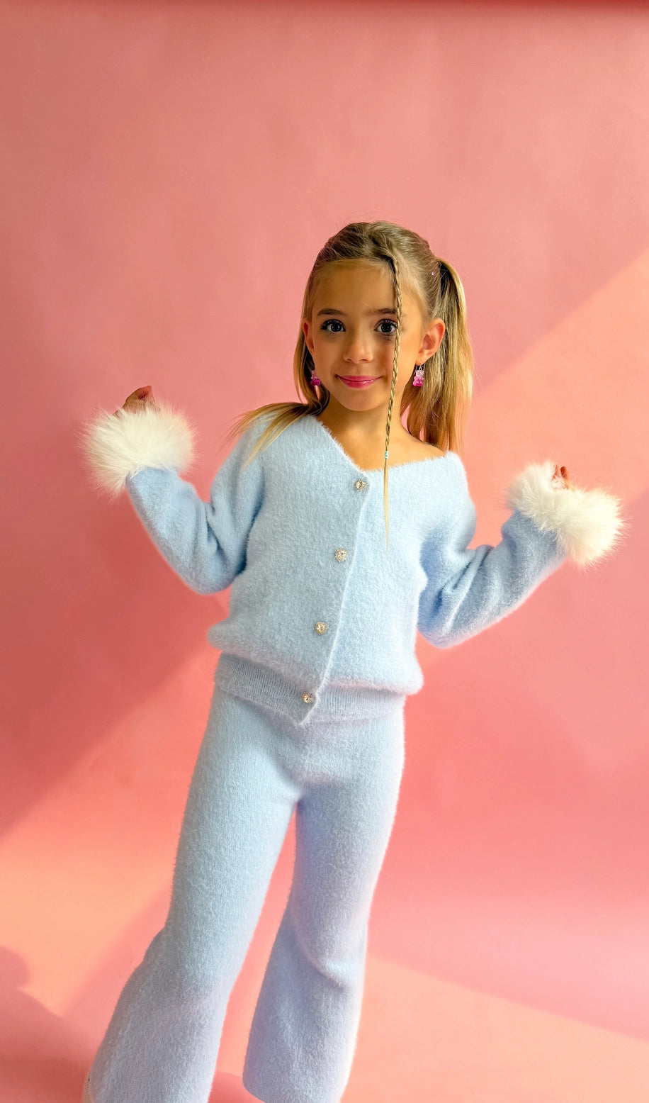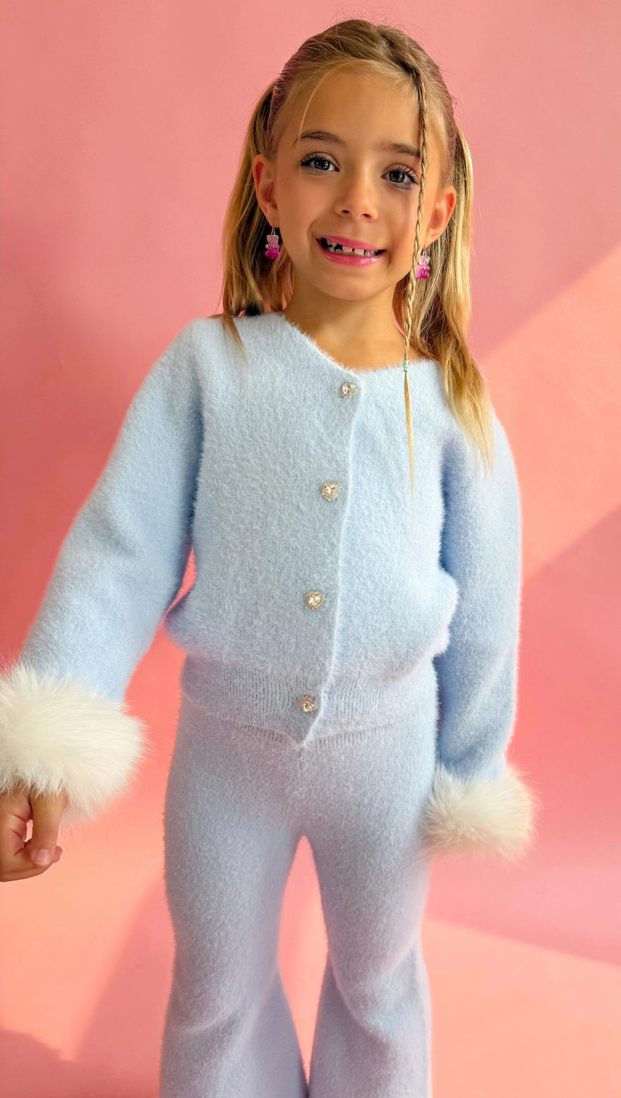 Stay cozy and stylish all winter long with our Winter Wonderland Set. This blue knitted set features heart gem buttons and fur cuffs, making it the perfect standout outfit ✨