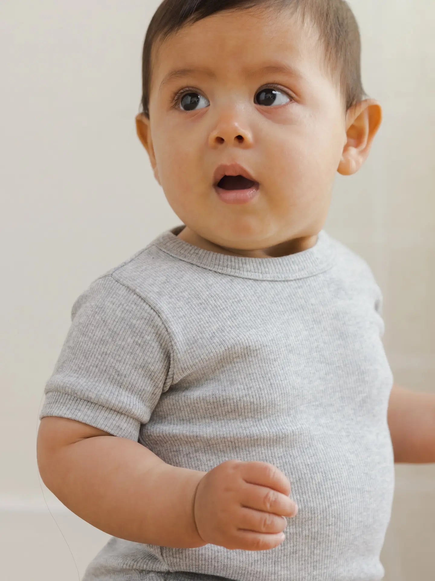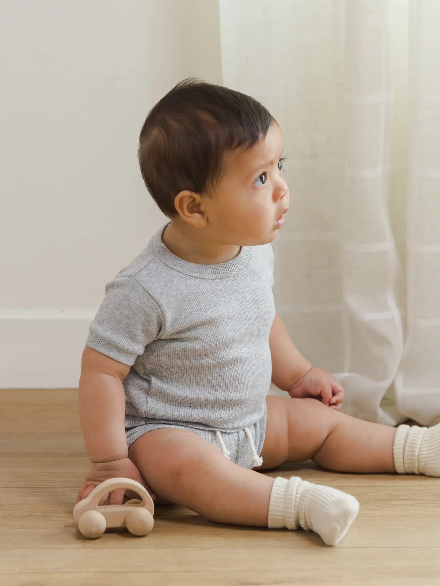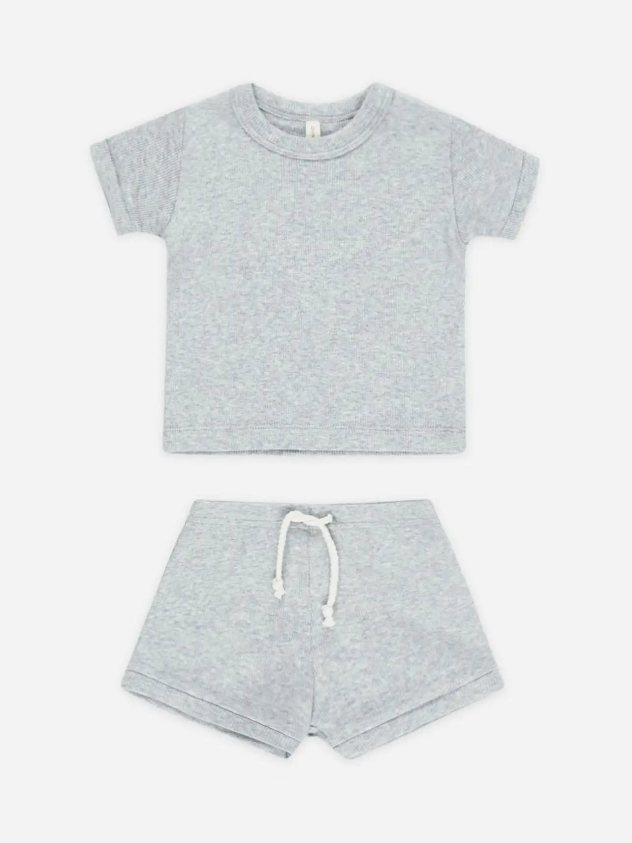 Our Shortie Set in our ribbed melange knit is a must-have for your little one's lounge and play wardrobe, featuring a cozy tee and coordinating shorts with an elastic waistband. Featuring our ‘dusty blue’ hue. Care: Machine wash. Tumble dry low. Made of 70% Organic Cotton / 25% Recycled Polyester / 5% Elastane Rib.