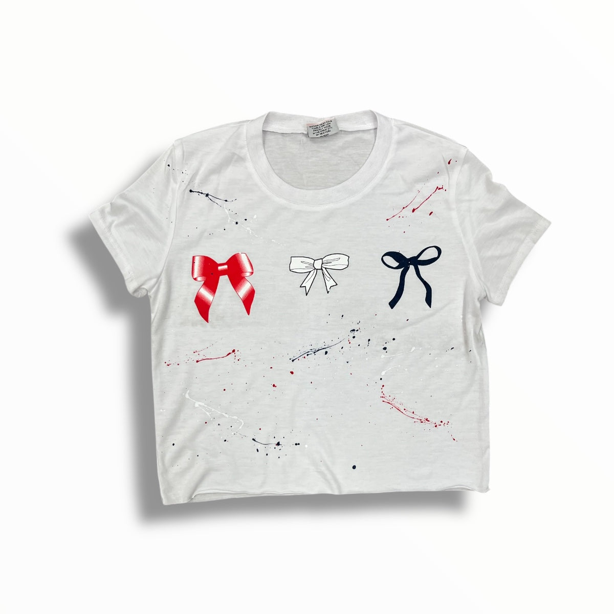 FIREHOUSE T-SHIRT - WHITE/RED WHITE AND BLUE BOW/SPLATTERED