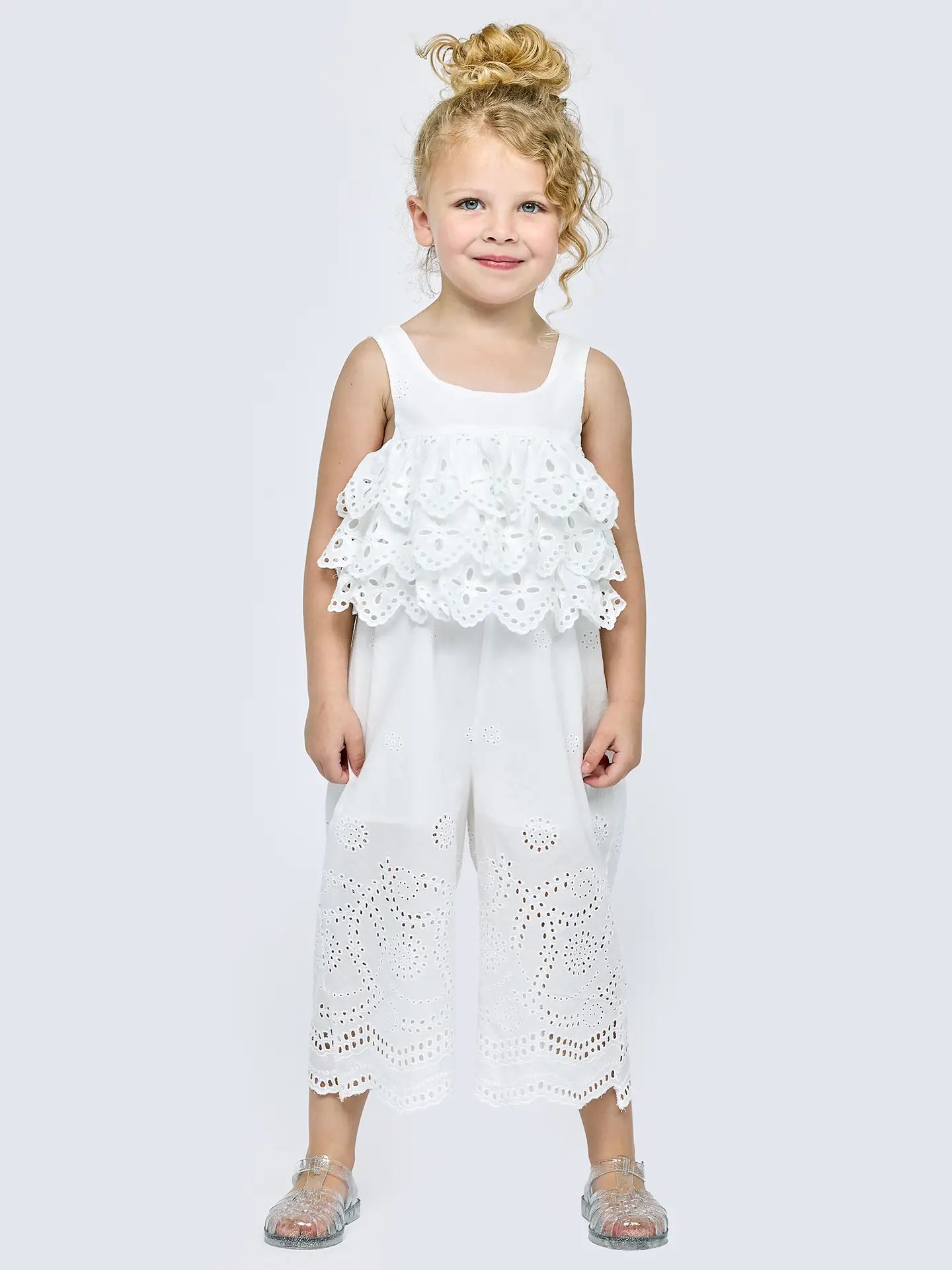Introducing our Eyelet Jumpsuit with Ruffle Bodice from Hannah Banana. Designed for the unique style and comfort of young girls, this jumpsuit is perfect for spring/summer. It's made from high-quality materials, featuring a ruffle bodice and intricate eyelet details. As part of the Hannah Banana collection, it reflects our commitment to creating fashionable, yet sensible clothing for girls.