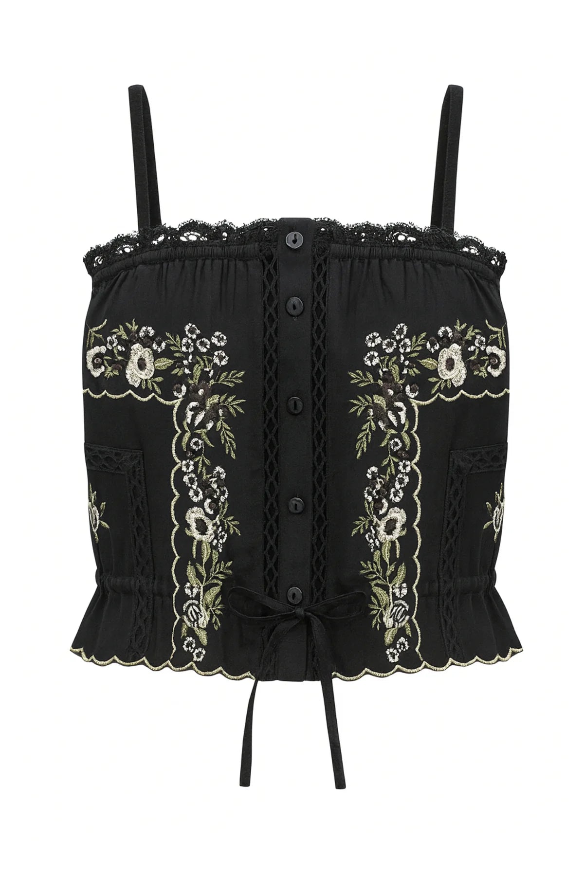 - Intricate floral embroidery