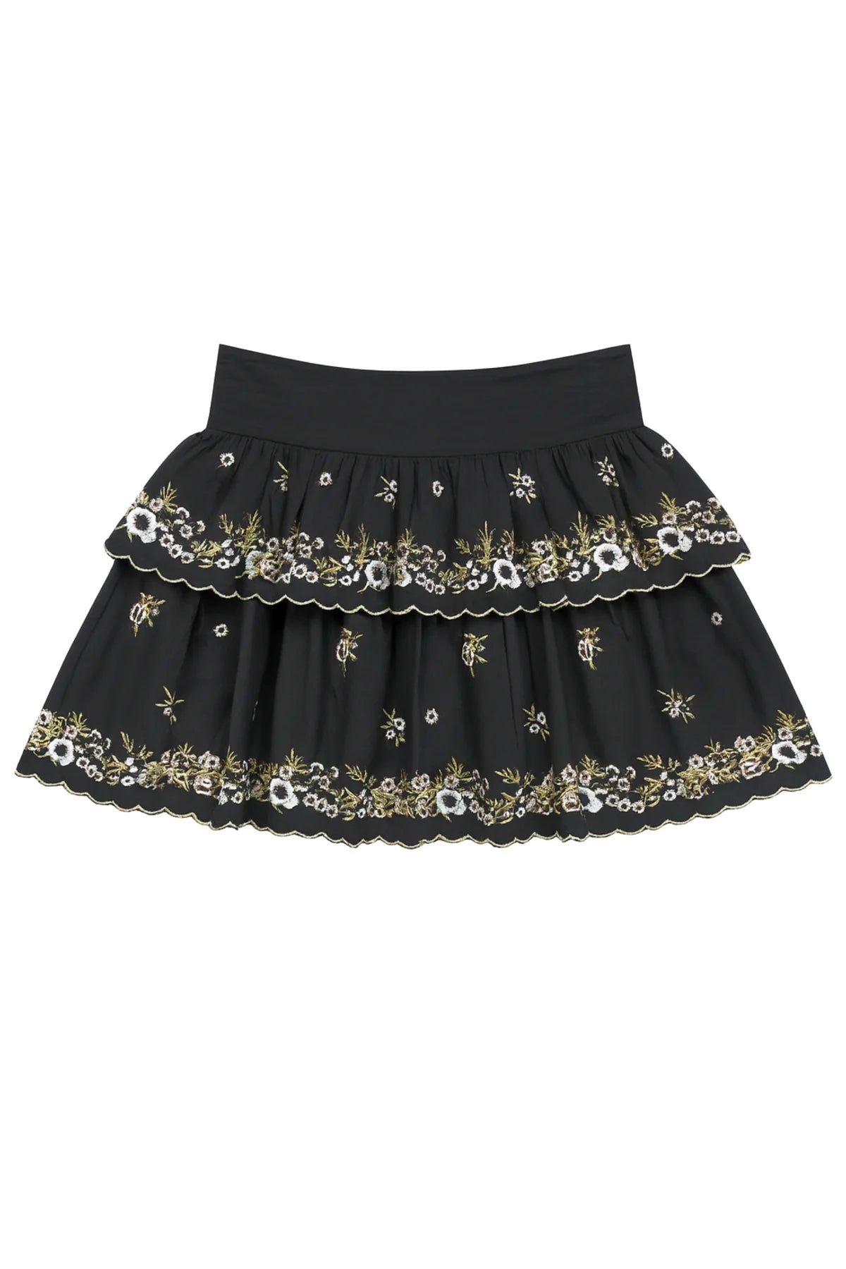 - Tiered mini skirt with scalloped embroidered hems