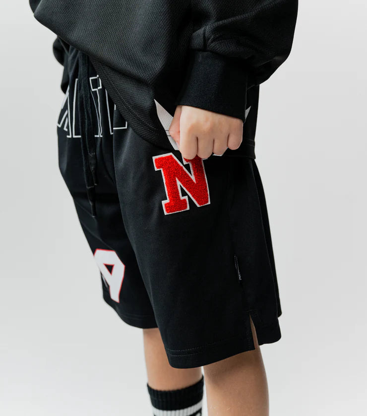 team nununu tryouts are in session and obviously your badass kid has already made the cut. they’re definitely going to want to start repping their new number 49 by wearing these wildly comfy gender-neutral shorts made of smooth active poly with slits up the legs & a stretchy drawstring waistband that makes sure your kid has the freedom to move, play, and win any time they wear them. of course, this fit says whatever right up top in outlined block letters because your kid plays their way. that's also why it’s got side pockets. perfect for stashing their super-secret playbook & writing down the rules as they make them up.