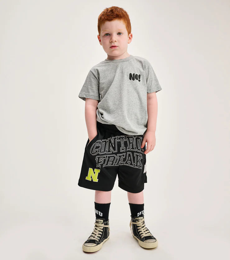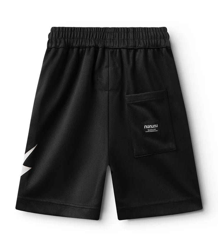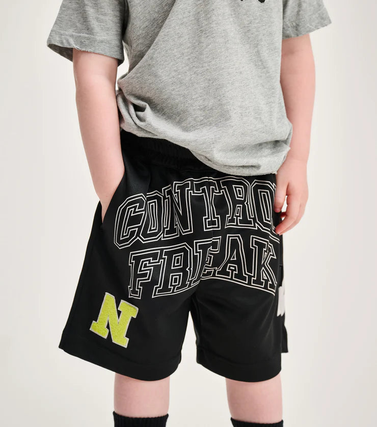 when you're playing to win you need a pair of shorts that are doing the most. these are it. they’re a gender neutral cut made of black active poly with a stretchy waistband for seamlessly moving & winning in any game. they’ve got sleek side pockets plus a pocket on the back with the nununu tag that’s perfect for stashing fan mail. to keep it extra interesting the front features our n patch in a totally touchable towel texture that stands out physically & visually in hot lime outlined in white. it also says control freak really big in a collegiate style font in outlined letters. to top it off, these shorts have a white lightning bolt on the side to let all the other players know that this kid is always ready to strike.