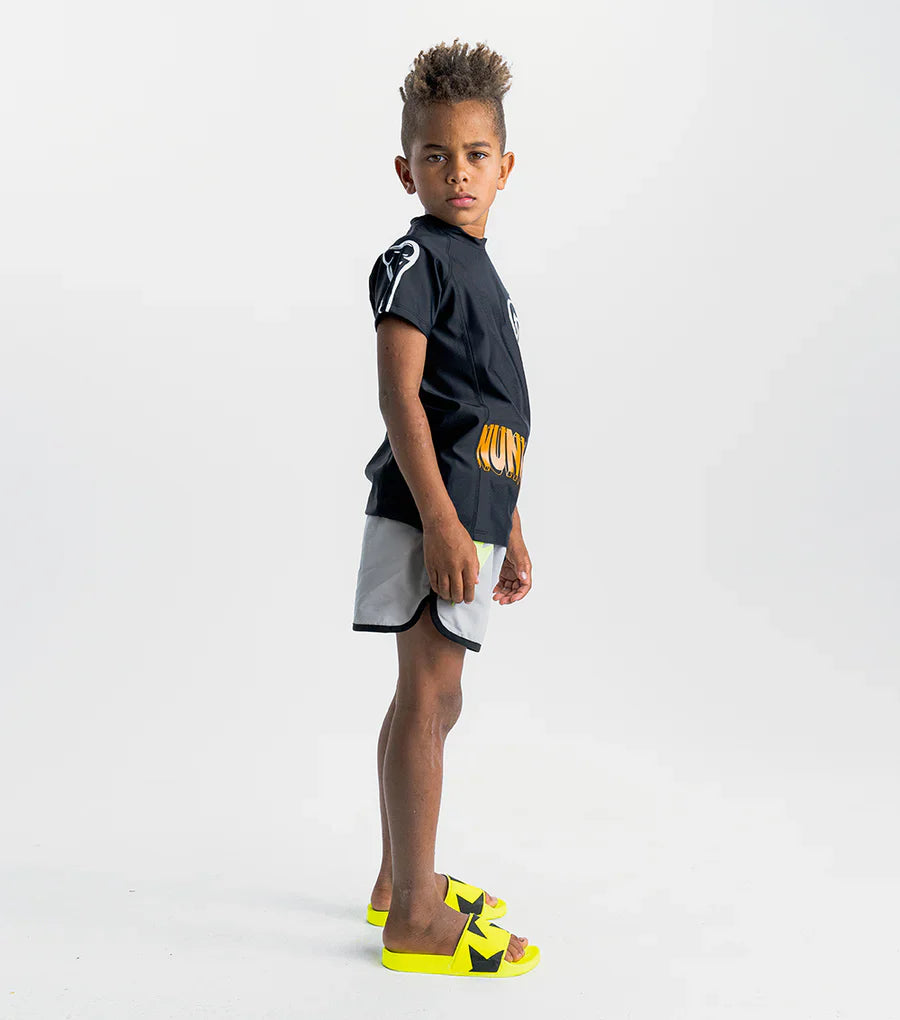 nothing says kook like the salty haired little human wearing this unisex short sleeve rashguard. they’ll be ready to catch waves with the skull head print created in collab with artist shai id alony. plus we’ve got an awesome bone on the sleeve in white to keep the edge factor cranked up as high as it will go. to hit the max, we’ve added the nununu rock n roll 3d logo print in bright orange. all the prints are intentionally cut off by the seam. because we love to keep 'em guessing, just like your kid.