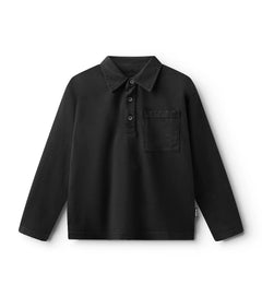 watch out dad’s closet, this shirt is coming for your all-time favorite look. it’s a classic, long sleeved polo made of a black pique so it’s super breathable with a ribbed collar just waiting to be popped. it’s a gender neutral cut with a washed sort of look that gives it a pre-loved through the decades feel. it’s a little faded and a little vintage in a way that seems like maybe it was a back to the future vibe.