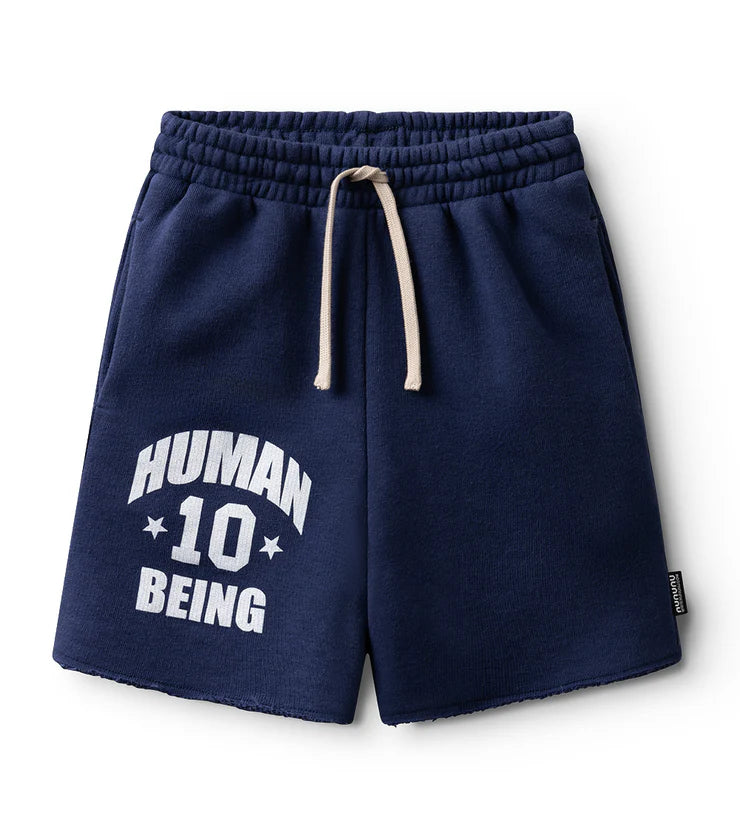 as mvp of team nununu, your kid should only have the best. that’s why these gender neutral sweatshorts are made of seriously soft indigo french terry. they’ve got human being printed loud & proud on the leg because that’s our mascot. no need to be anything other than you right? and because your little winner is our star player, we’ve got the number 10 printed there too, surrounded by a star on each side. sleek side pockets ensure they have the perfect place to stash their game plan & a cinched waistband makes sure they’re always ready to score the next point. oh yeah, and the bottom hem was left totally raw like the legs were cut right off. because we know your kid needs freedom to move & play.
