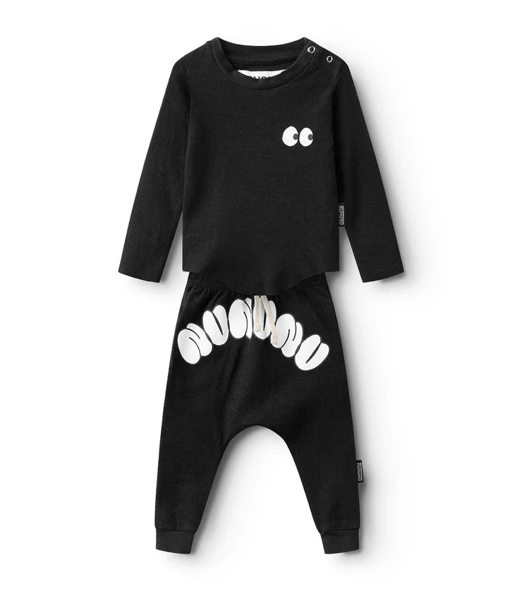 meet the two-piece set that’s giving as much attitude as your tiny human. this gender neutral black slub fit is ribbed & ready to go with raw edges and our sussed-out side eyes print so they can maintain their mood even during nap time. ankle cuffs & sly pockets keep it sporty while in-shoulder snaps give it that easy on & off, just how you want ‘em. oh yeah and just below the cinched elastic waistband you’ll find our big, bubbly logo looking like an arch of balloons ready to pop. because the world needs to know your baby is the life of the party.