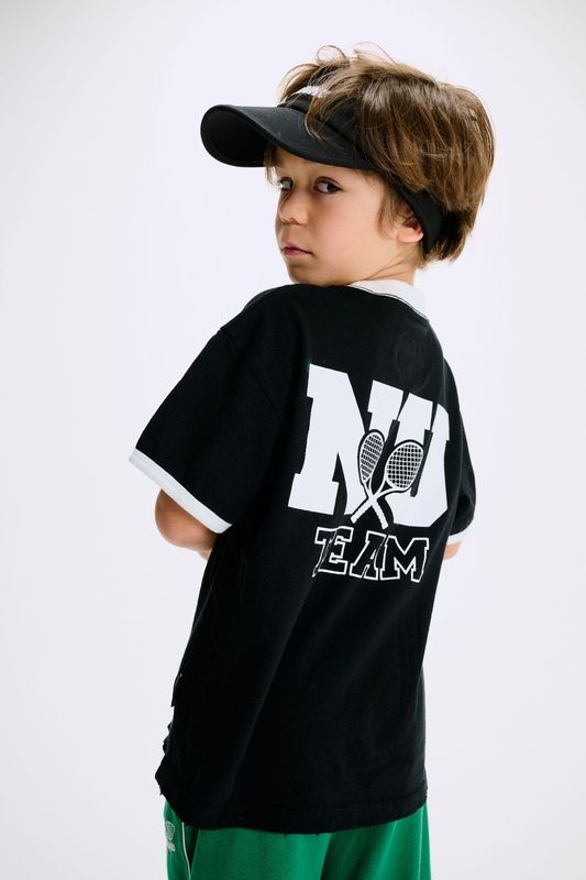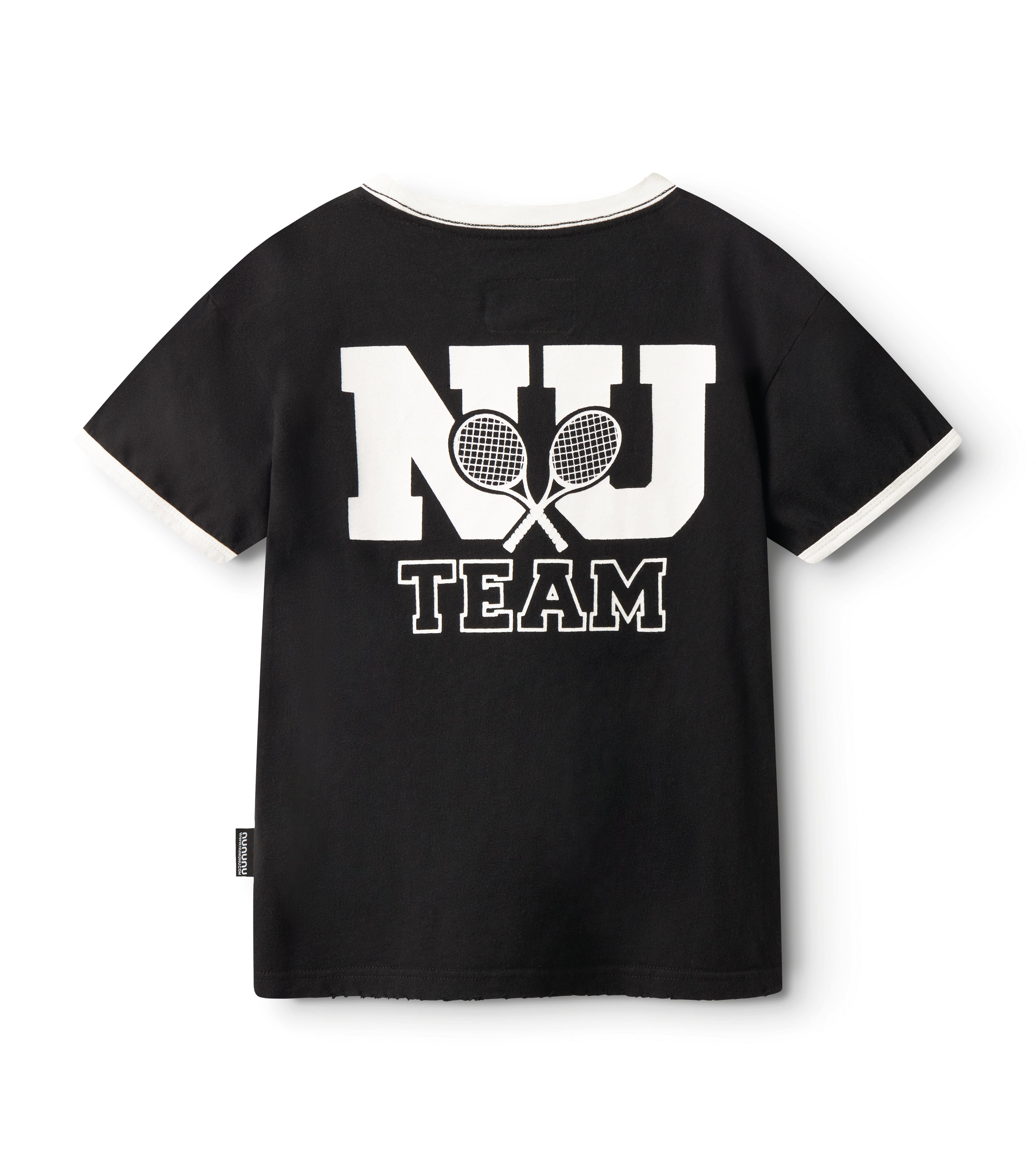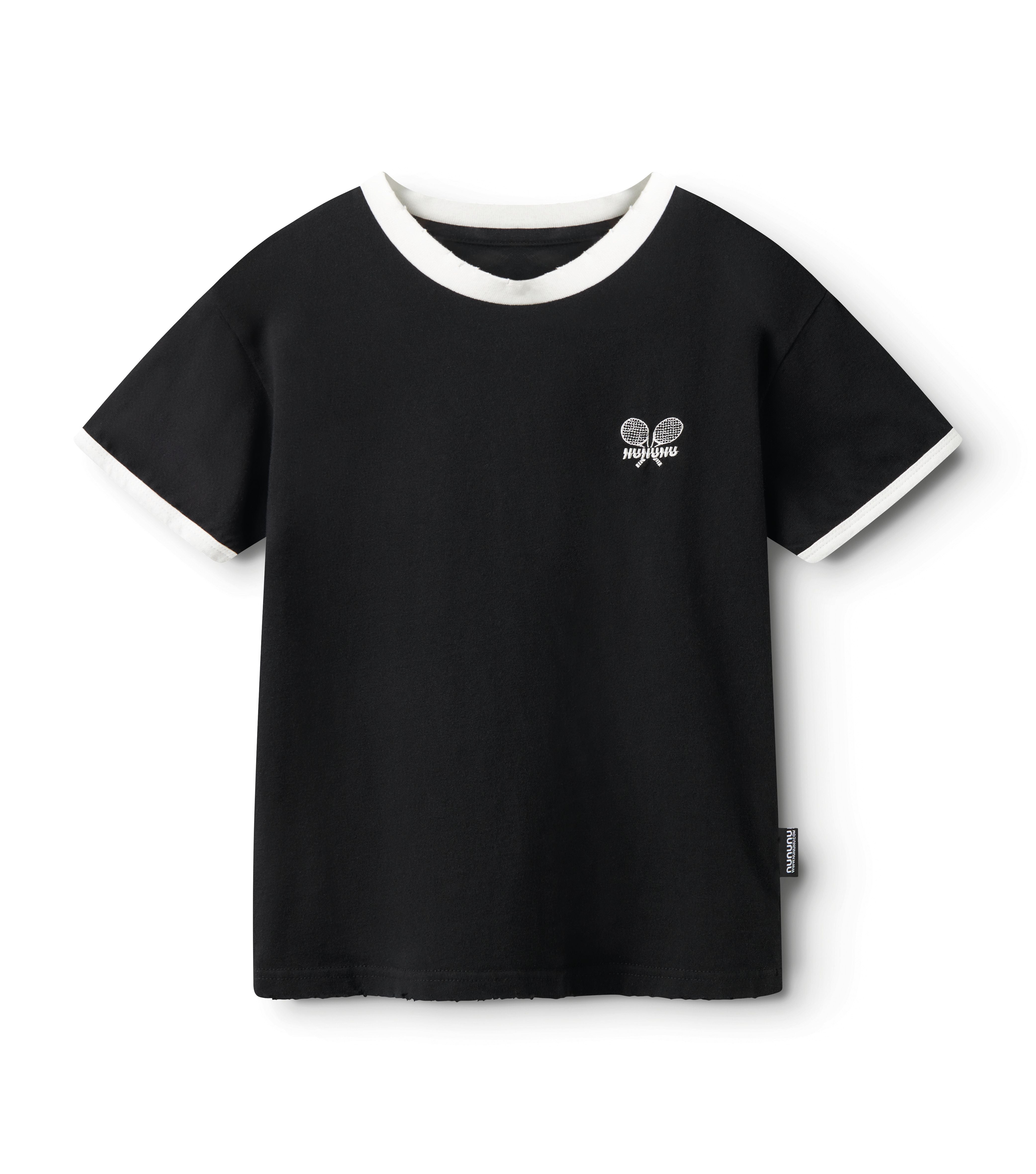 rack up points & style with this court-worthy tennis t-shirt, equal parts prep & grunge, it’s made of white heavy single cotton with a boxy kind of look that always fits just right. we swapped cross bones for rackets in our nununu tennis logo embroidered on the chest. plus, the back has the same dueling rackets printed nice & big alongside the words nu team in our collegiate style font. it’s outlined in white on the collar & sleeves for that retro feel while custom deconstruction on bottom & the collar give it that rule breaker aesthetic.