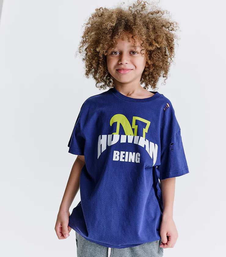 every tiny human needs a tee that represents their essence. for your kid, we’re pretty sure this one’s it. it’s a heavy single indigo cotton fit with a classic gender neutral cut. it’s got heavy deconstruction like your little hero has been rescuing stray cats all day. of course, that’s why the print is split in two with human being written across the bottom half in comic book style lettering while our mysterious take on nu shines in hot lime like a bat signal. because your kid’s not just any human being. they’re super.