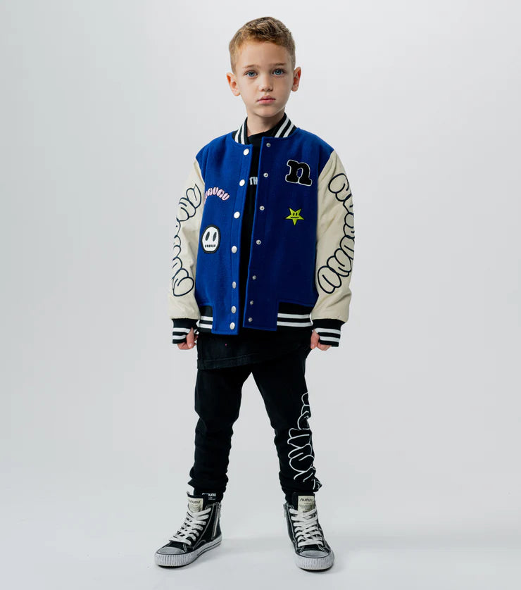 we’ve designed the quintessential cool kid piece just for your little human. it’s a gender-neutral varsity-style jacket with snap buttons and oh sooo many patches. it’s peppered with our n, star, smile, and bubbly nununu ones, plus it's embroidered on the sleeve with a balloon-ish take on our logo. the sleeves are made of a soft nylonish material that gives a hint to the original leather look while the collar, cuffs, and hem all have a stretchy black & white stripey look where you’ll find our fave thumbholes. yeah, we know it’s the bomb.