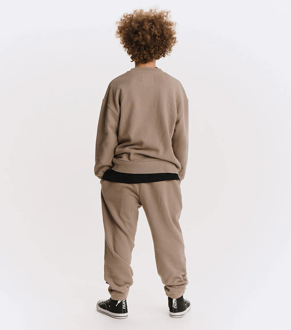 keep it simple, but say it loud in these gender neutral stone-hued french terry sweatpants. they bring cozy comfort with a creative streak, featuring a patch that says “be that kid” in a font that looks like they drew it on themselves. it’s there to remind the world that they’ll always be unapologetically themself. elastic waist, elastic cuffs, & side pockets, make it equal parts comfy & functional. perfect for living life to the fullest and never holding back. as kids do.