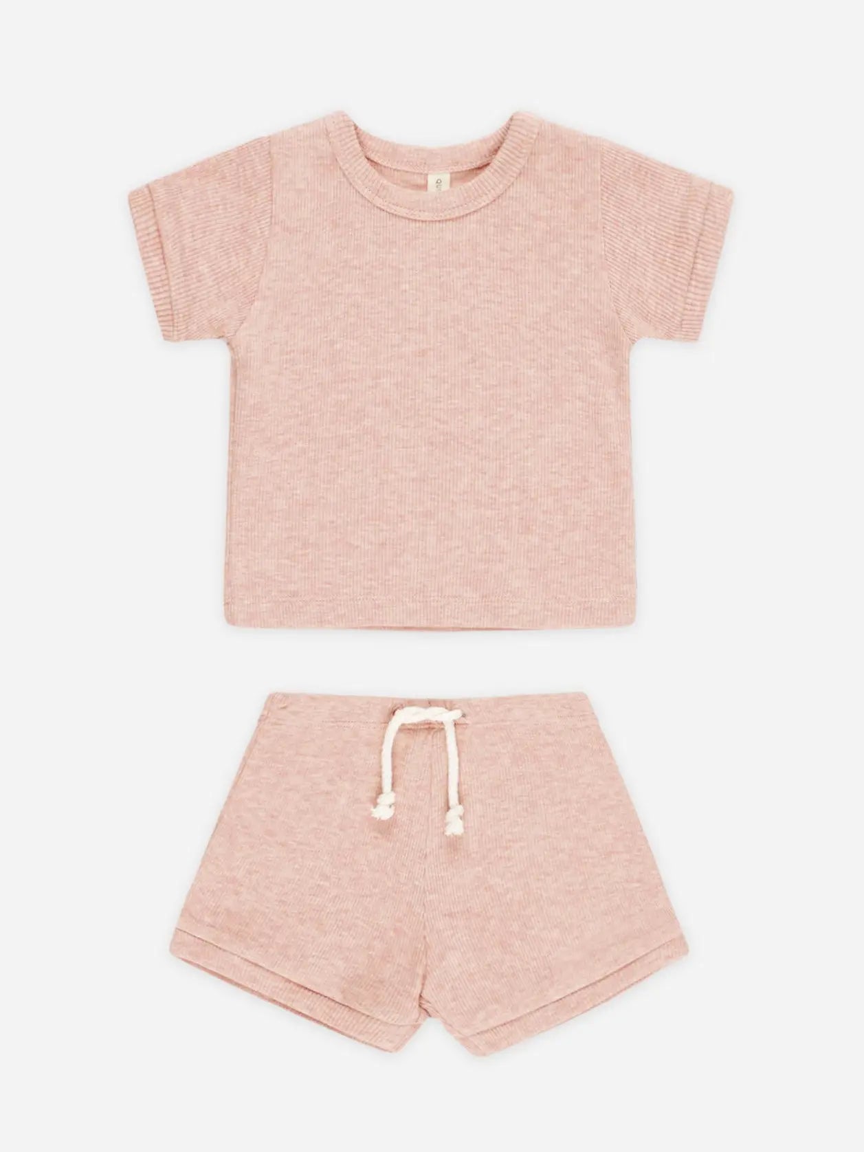 Our Shortie Set in our ribbed melange knit is a must-have for your little one's lounge and play wardrobe, featuring a cozy tee and coordinating shorts with an elastic waistband. Featuring our ‘rose’ hue. Care: Machine wash. Tumble dry low. Made of 70% Organic Cotton / 25% Recycled Polyester / 5% Elastane Rib.