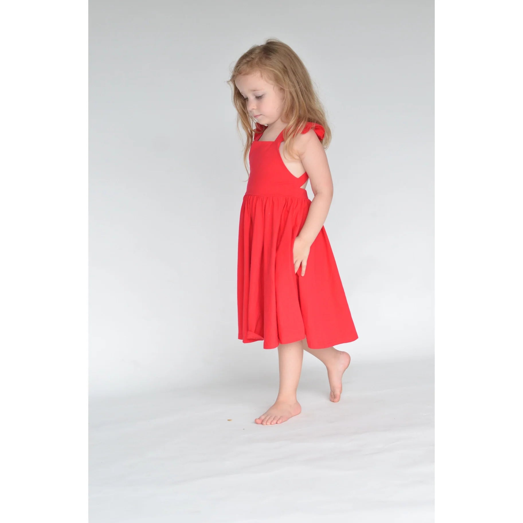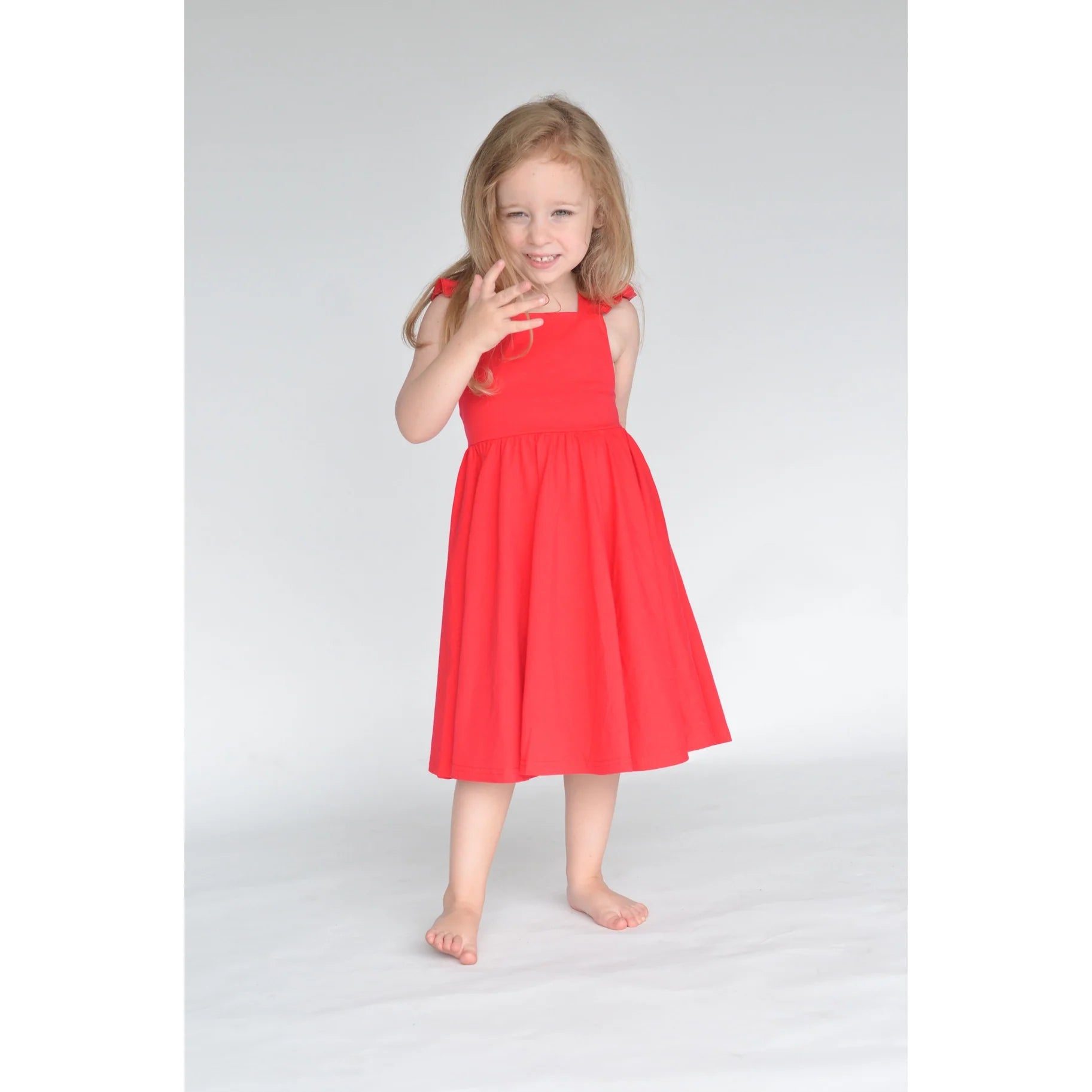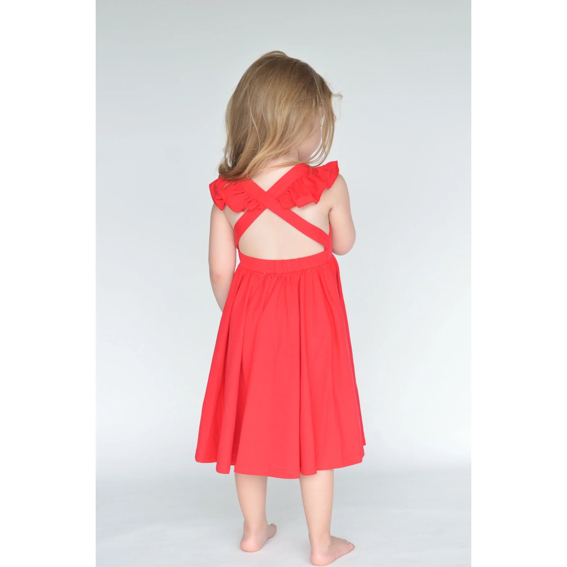 This dress is so beautiful, and the solid color pairs with almost any accessory! Featuring a ruffled cross back, full circle skirt and hidden pockets in the seam - we've got the details covered! Made of 95% premium jersey cotton and 5% spandex, this dress is made to feel soft and comfy for your little ones!
