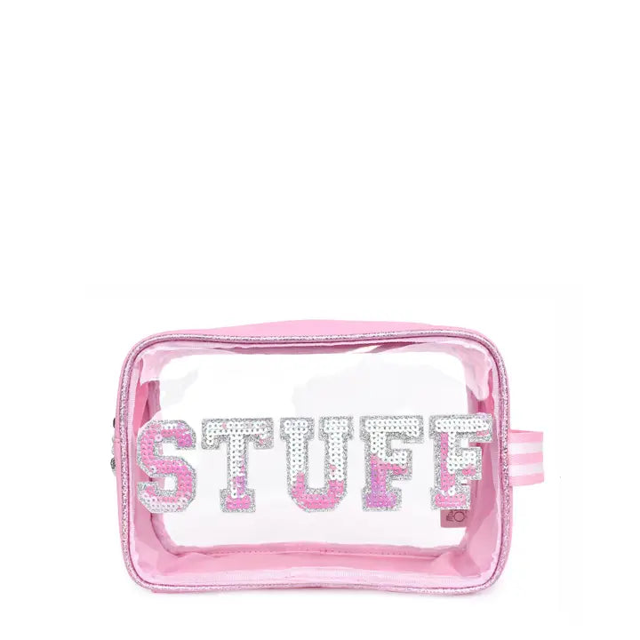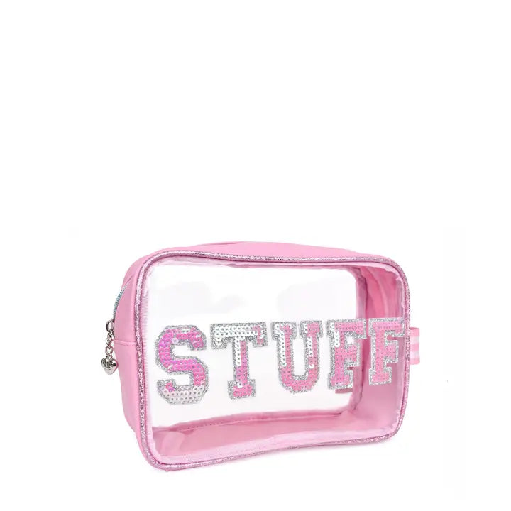 Make this sequin pink 'Stuff' pouch a part of your princess's paradise! Featuring sequin varsity-letter appliqués in a cotton candy shade, this pouch is a storage essential for the gals who like to keep it fancy. Measures Approx. - 6.00”H x 9.00”W x 3.00”D