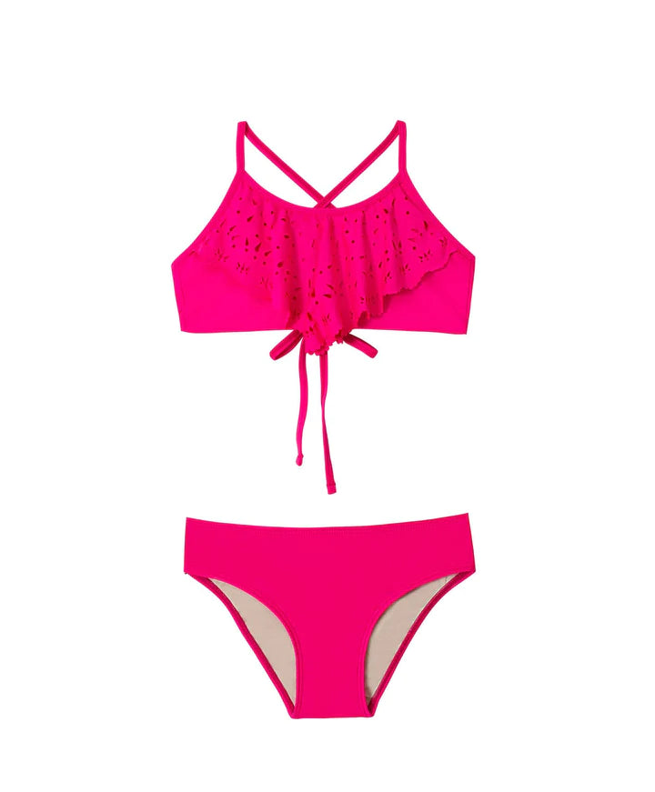 This kids bikini features a ruffled top & scalloped trim. There is a criss cross tie back for a more customized fit. Our kids suits run small so we recommend sizing up if you are unsure.