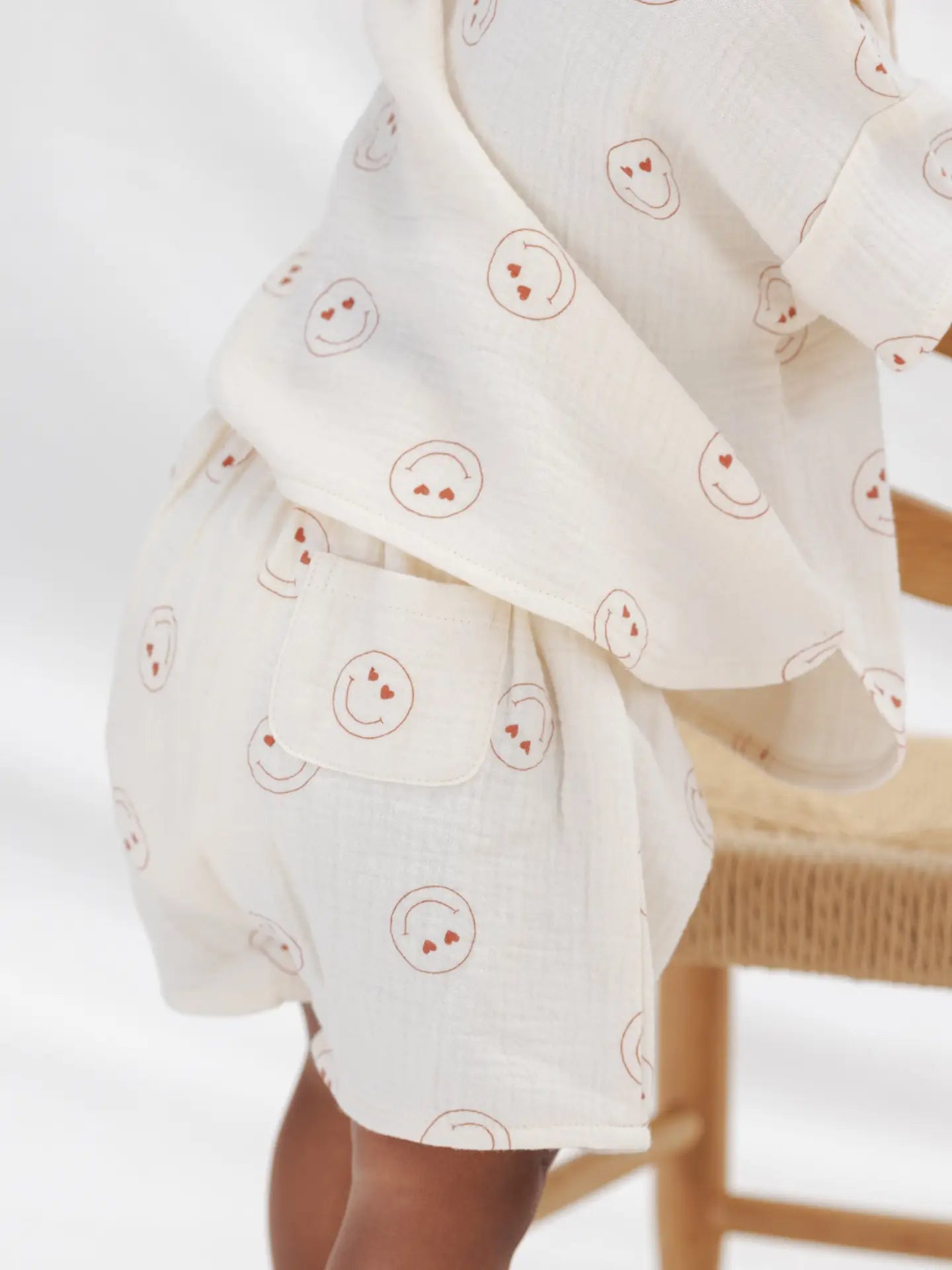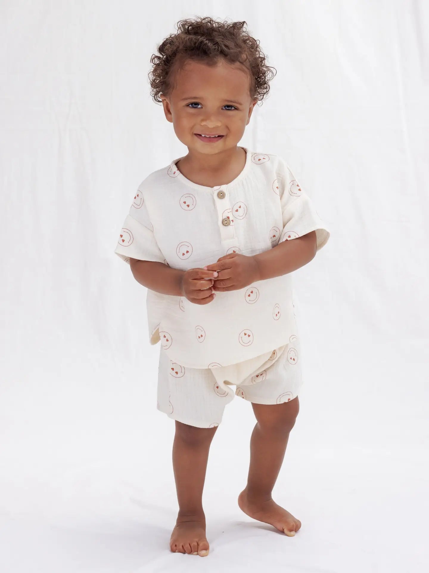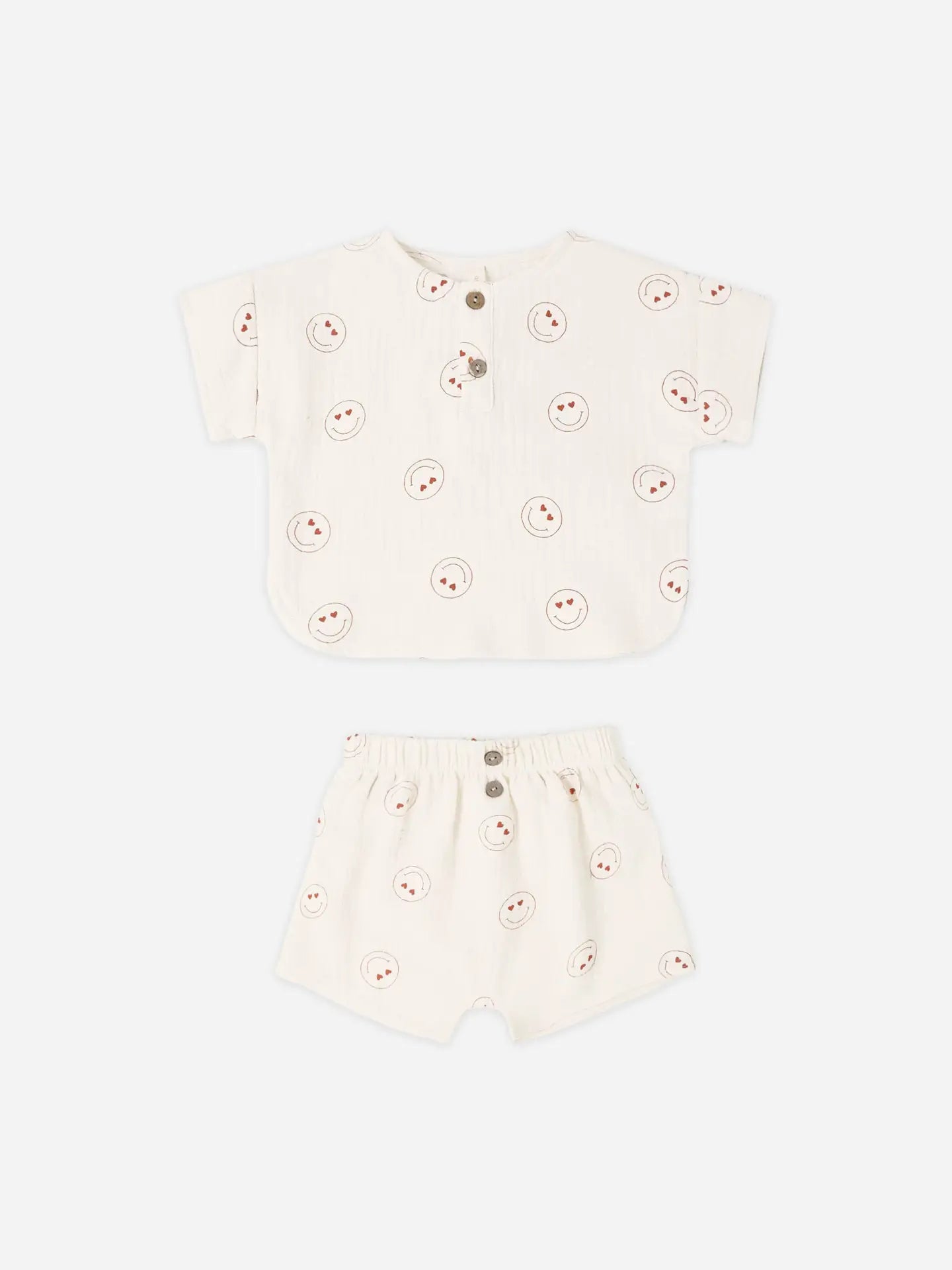 Our Woven Boxy Top + Short Set designed with coconut button detail is a fun and easy look for the season! Featuring our ‘heart eyes’ print on our 'natural' hue. Care: Machine wash cold. Lay flat to dry. Made of 100% organic cotton.