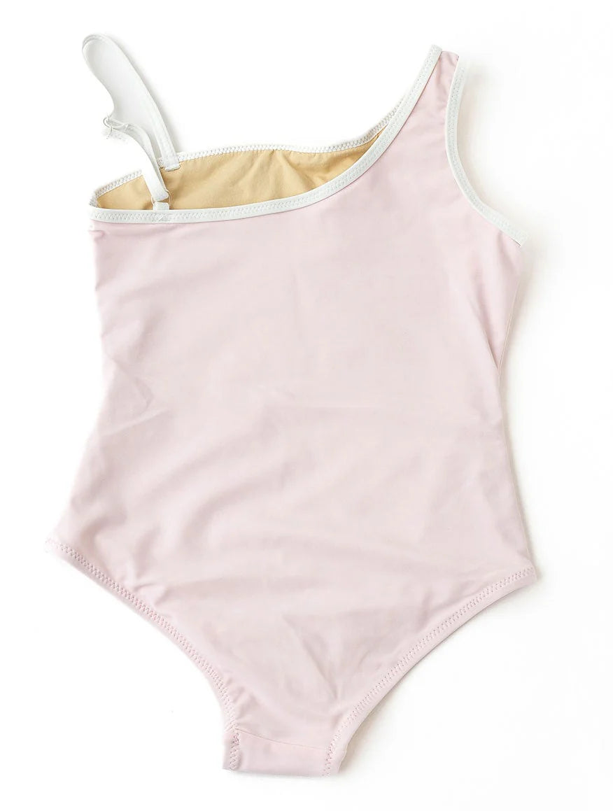 A sequin-embellished palm tree brings beachy energy to a kid-sized swimsuit styled with asymmetric straps.