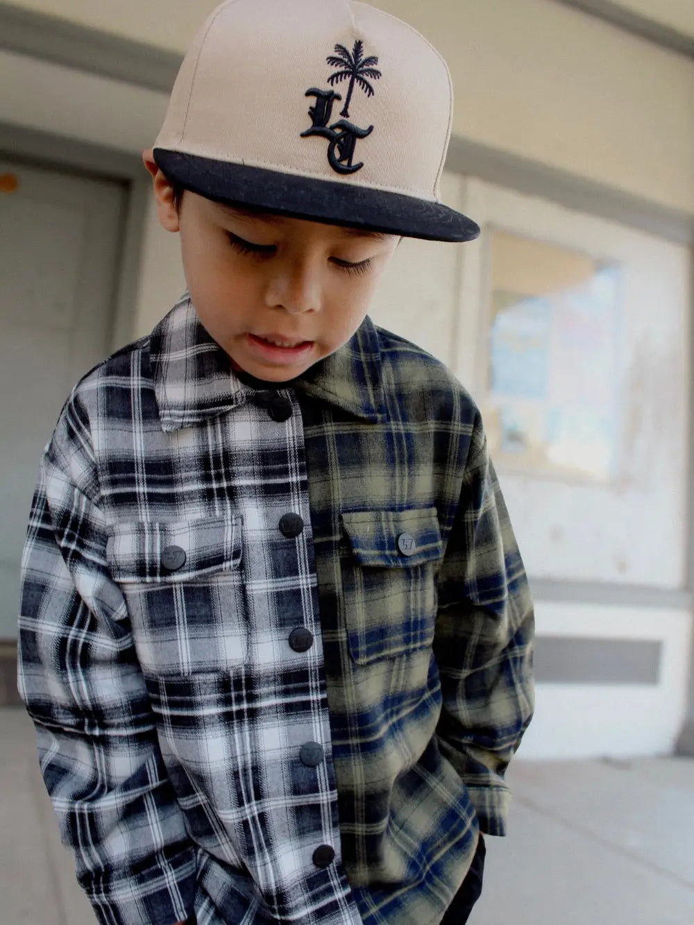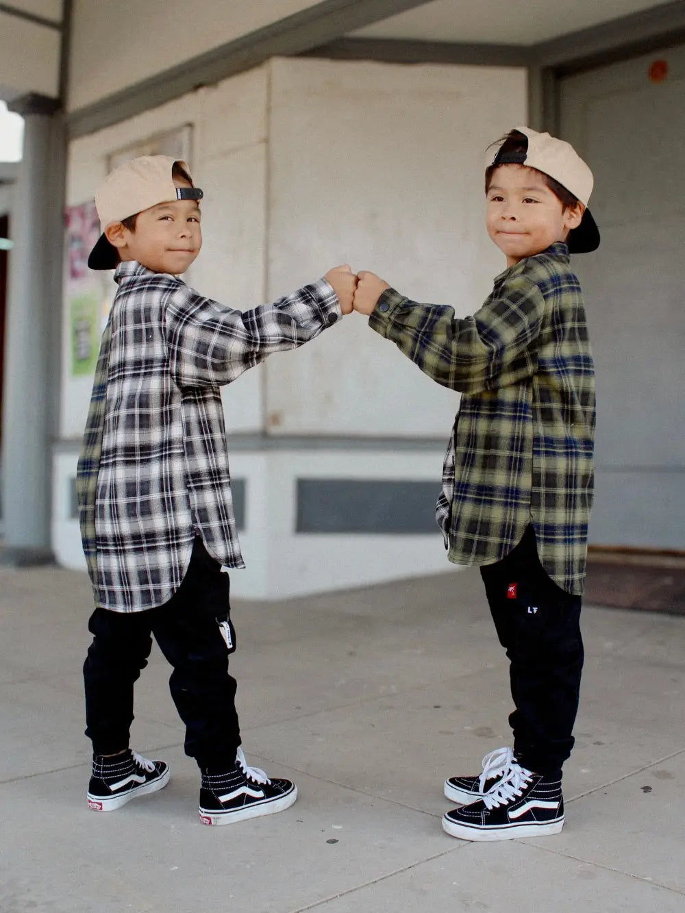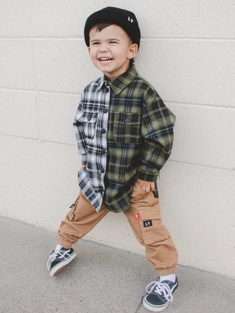The TWO TONE flannel splits it straight down the middle — black plaid on one side, deep green on the other. Cut oversized with front chest pockets, custom LT snap buttons, and just the right drape to layer or wear solo. This material is so soft and such high quality, you'll want to steal it for yourself. It's an everyday staple but the design keeps it anything but boring. Fit Facts: • 100% soft, breathable cotton flannel • Split two-tone design: black plaid + green plaid • Oversized fit for layering or wearing solo • Front chest pockets with snap buttons • Unisex style built for all-day wear Fits true to size with an oversized feel. Wash cold, tumble dry on low, wear on repeat.